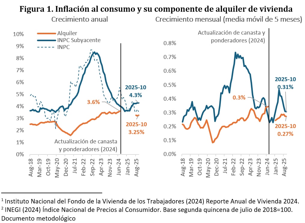 Nota: Respecto de la discontinuidad que se observa en julio de 2024, vale la pena mencionar que el INPC tuvo una actualización metodológica en ese año que implicó cambios en los genéricos que integran la canasta de consumo, su peso en el indicador general de precios y la introducción de índices encadenados para mantener la continuidad temporal en la serie de la inflación (INEGI, 2024). En el caso del genérico renta de vivienda, se pausó la actualización del indicador nacional y hubo una actualización del nivel base con el que se reportan las cifras de los precios promedio a partir de agosto de 2024.