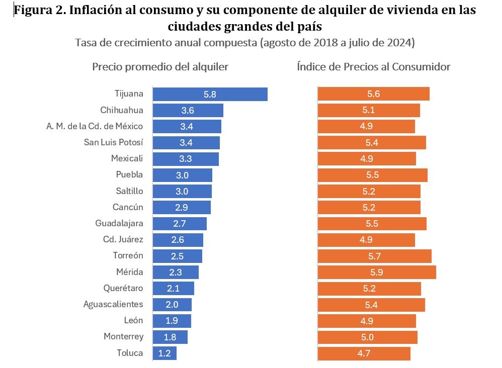 En la dimensión regional, el recuadro revisa las 17 ciudades “grandes” del país según la clasificación ocupada por INEGI. La Figura 2 compara, en cada ciudad, el crecimiento de las rentas con la inflación general y concluye que, salvo un caso, los alquileres han aumentado menos que el INPC. El pánel izquierdo ordena estas ciudades por su crecimiento anual promedio de rentas entre agosto de 2018 y julio de 2024: la ciudad con mayor aceleración, Tijuana, registró 5.8 % anual, ligeramente por encima de su inflación (5.6 %, pánel derecho). En contraste, la siguiente ciudad en el ordenamiento, Chihuahua, tuvo una variación promedio de 3.6 % anual en las rentas frente a 5.1 % en los precios generales al consumo. Esto refuerza la idea de que, en general, las rentas han sido más contenidas que los precios al consumidor.