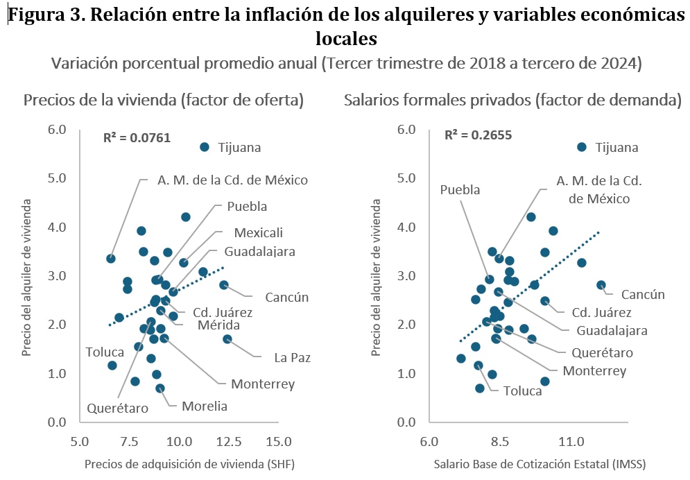 El recuadro explora posibles vínculos entre factores de oferta y demanda y los precios del alquiler. En la Figura 3 (pánel izquierdo) se compara el crecimiento anual promedio de las rentas con el de los precios de adquisición estimados por la Sociedad Hipotecaria Federal. Bajo la hipótesis de que, en el corto plazo, mayores aumentos en los precios de compra pueden trasladarse a mayores rentas —vía oferta de vivienda en alquiler—, la dispersión sugiere una relación positiva, aunque débil (ajuste lineal R² = 0.0761). En el pánel derecho, las rentas se relacionan con el crecimiento anual promedio de los salarios del sector formal privado, medidos a partir de la variación del salario base de cotización publicado por el IMSS a nivel estatal, como aproximación a un canal de demanda. En este caso, la asociación lineal muestra un mejor ajuste (R² = 0.2655).