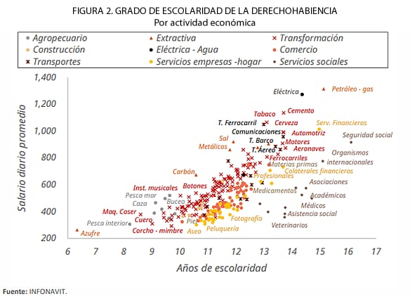 La imputación del grado de escolaridad a la derechohabiencia del INFONAVIT permite realizar análisis más desagregados a nivel regional y por sector económico. Por región, existe una correlación positiva entre el tamaño del mercado laboral, nivel educativo y salario. Además, parece haber diferencias en el retorno de la educación asociadas a las características de las ciudades, como puede ser una mayor concentración de las economías locales en actividades de menor valor agregado (comercio, servicios personales, agricultura, construcción) aunado a un alto nivel de informalidad, por lo que los escasos puestos formales disponibles se concentrarían en los servicios públicos (federal y local), profesionales y administrativos, donde se requieren títulos universitarios o técnicos (lo que eleva la escolaridad promedio del sector formal en esas ciudades). En contraste, ciudades en donde una proporción considerable de empleos se concentran en industrias manufactureras que incorporan trabajadores de baja escolaridad en el sector formal ocasionarían una baja en su promedio.